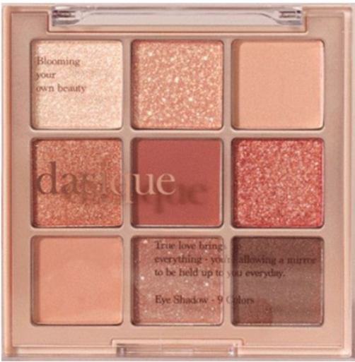 데이지크 섀도우 팔레트 (15 베이지니트) 34,000원 9구 팔레트, 웜 브라운 계열, 매트/쉬머/글리터 포함 다양한 텍스처, 데일리 룩에 최적, 높은 발색력 일부 컬러의 펄 입자가 큼